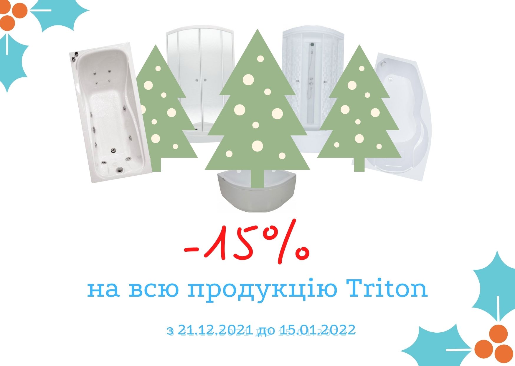 Новогодние скидки на товары Triton ( Акция закончилась! ) 21.12.2021 Акция C 21.12.2021 по 15.01.2022 скидка 15% на всю продукцию Triton -акриловые ванны -гидромассажные ванны -душевые кабины и боксы -акриловые поддоны -душевые ширмы на ванны и аксессуары к ваннам -гидромассажное оборудование КАТАЛОГ ТОВАРОВ | СПИСОК МАГАЗИНОВ | МАГАЗИНЫ НА КАРТЕ Информация для наших партнеров. (пишите на 3tn.in.ua@gmail.com какие размеры баннеров нужно сделать для вашего сайта).