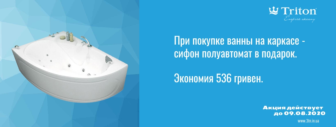 Покупайте ванну Triton на каркасе и экономьте 536 гривен, получая фирменный сифон-полуавтомат в подарок. Широкий модельный ряд позволяет с лёгкостью подобрать нужный размер ванны прямоугольной, ассиметричной или треугольной форм.